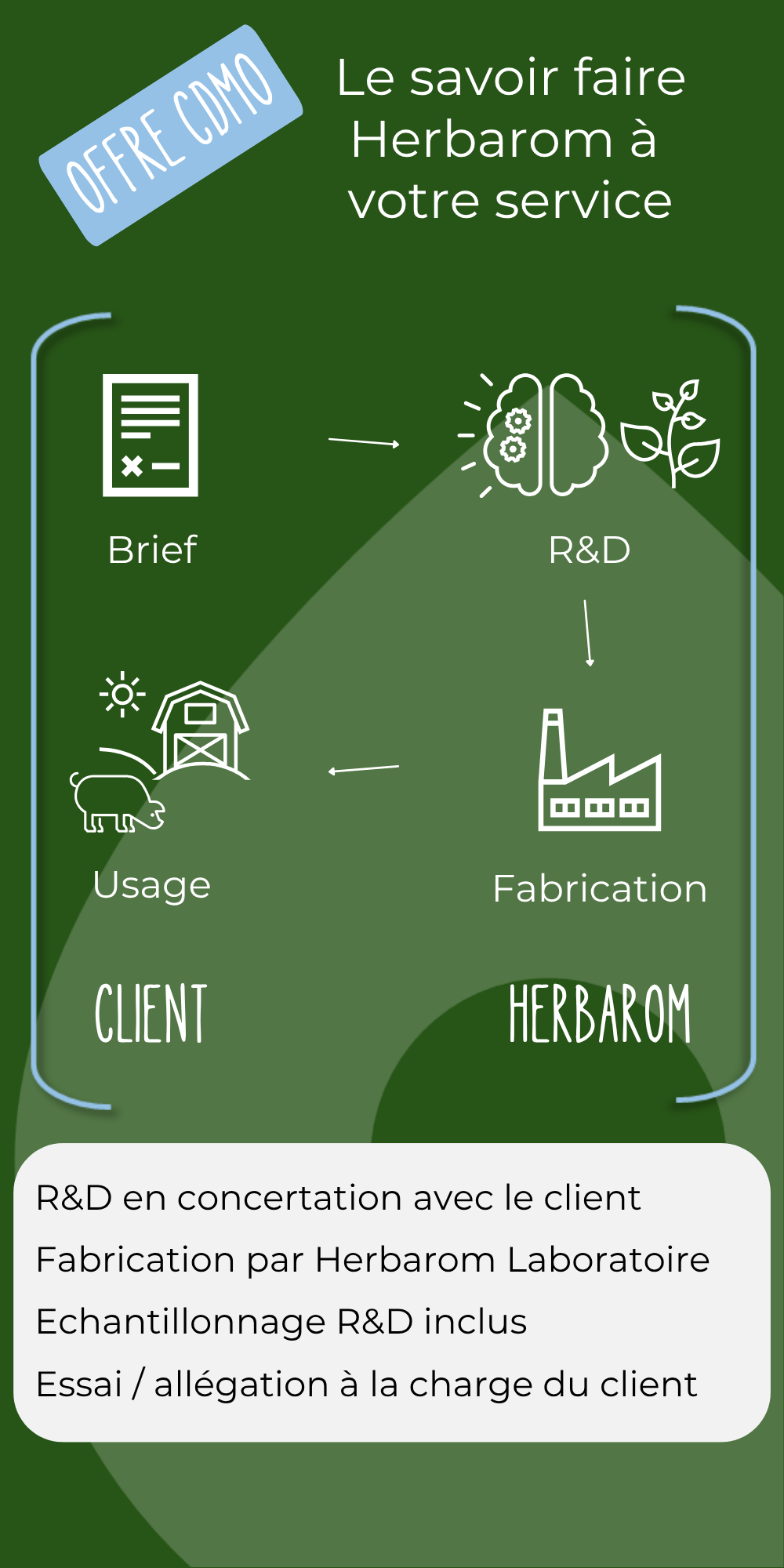 Chez HERBAROM, nous maîtrisons l’ensemble du processus du développement de solutions sur-mesure. Que ce soit dans la culture, le sourcing, l’extraction, la formulation, le support réglementaire, le développement et la mise en œuvre industrielle de vos produits, nous intervenons à chaque phase de votre projet de nutrition animale, et plus largement de bien-être animal.